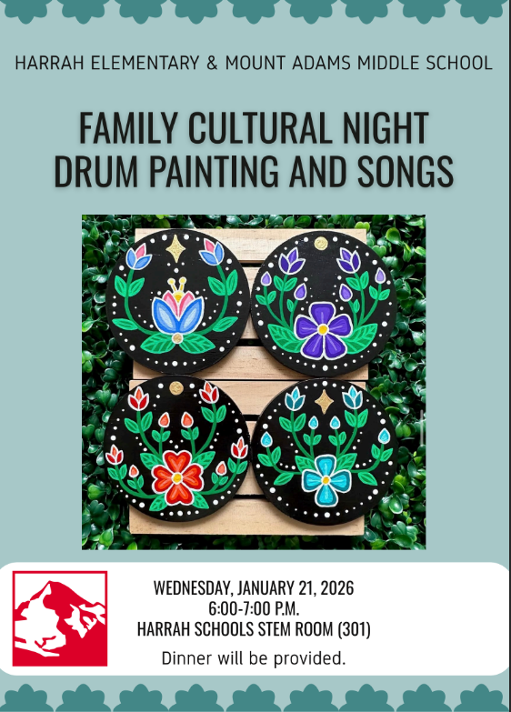 All are invited to attend tomorrow's event, Cultural Family Night- Native American Drum Painting and Songs. This event is at Harrah Elementary/Mt. Adams Middle School and begins at 6:00 p.m.